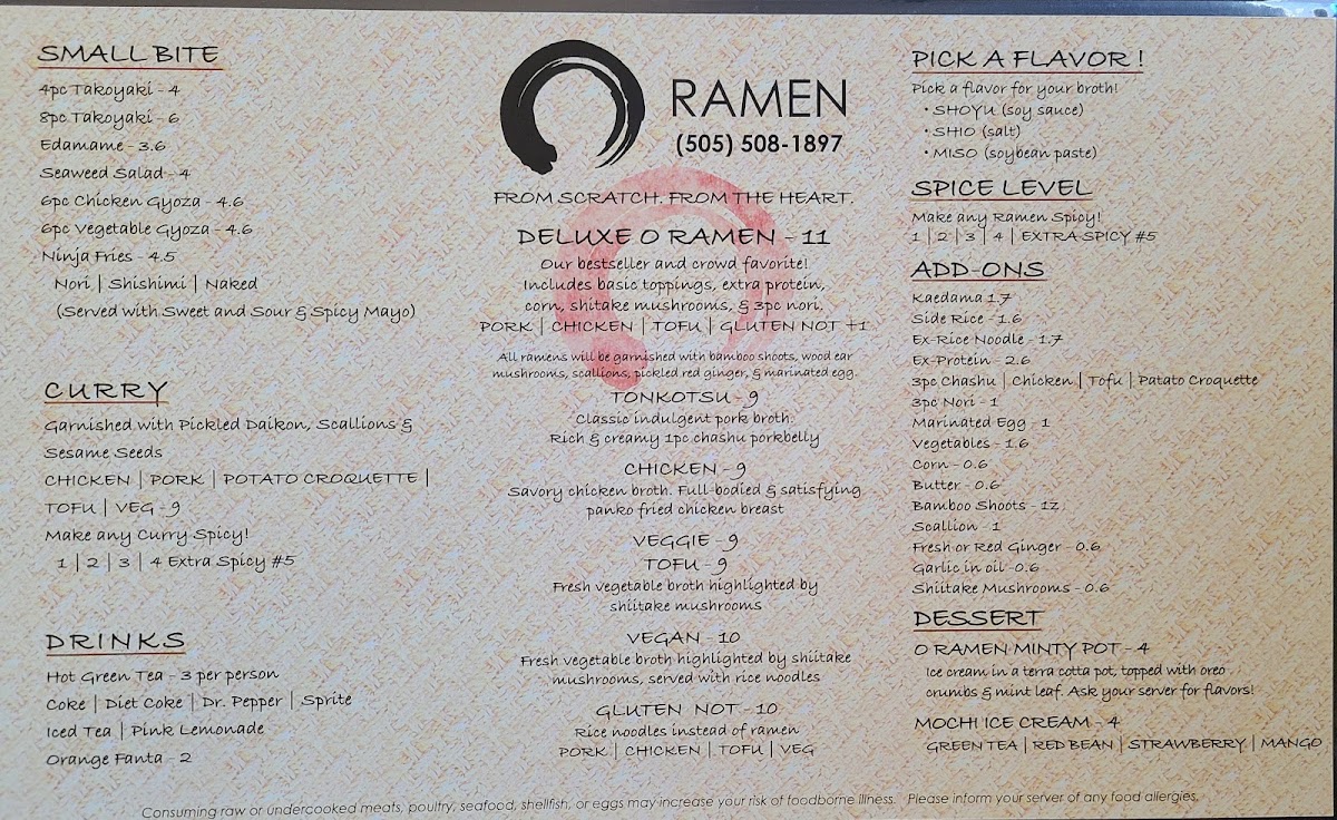 Welcome to O Ramen, a culinary gem located at 2114 Central Ave SE, Albuquerque, NM. This cozy eatery serves an exquisite array of ramen and Japanese curry that will tantalize your taste buds. Highlights of the menu include the Deluxe O Ramen, a crowd favorite brimming with savory pork or chicken broth, extra protein, and delectable toppings like shiitake mushrooms and nori, priced at just $15.30.
